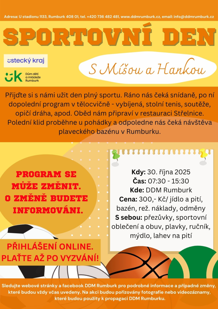 Přijďte si s námi užit den plný sportu. Ráno nás čeká snídaně, po ní dopolední program v tělocvičně - vybíjená, stolní tenis, soutěže, opičí dráha, apod.