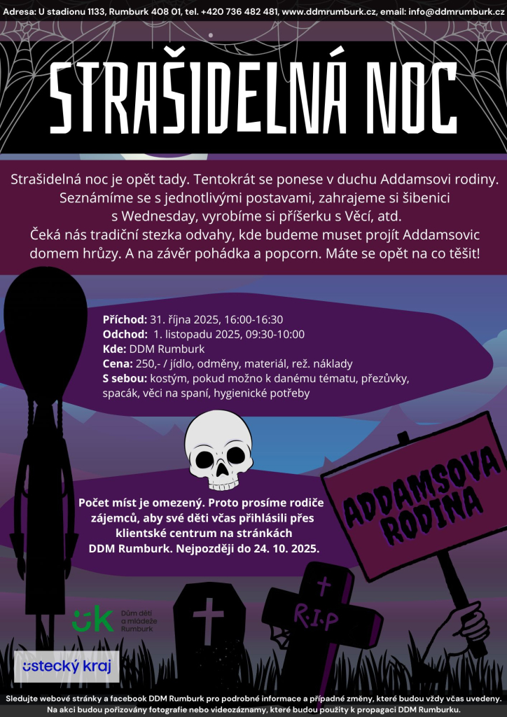 Strašidelná noc je opět tady. Tentokrát se ponese v duchu Addamsovi rodiny. Seznámíme se s jednotlivými postavami, zahrajeme si šibenici z Wednesday, vyrobíme si příšerku s Věcí, atd. Čeká nás tradiční stezka odvahy, kde budeme muset projít Addamsovic domem hrůzy. A na závěr pohádka a popcorn. Máte se opět na co těšit!