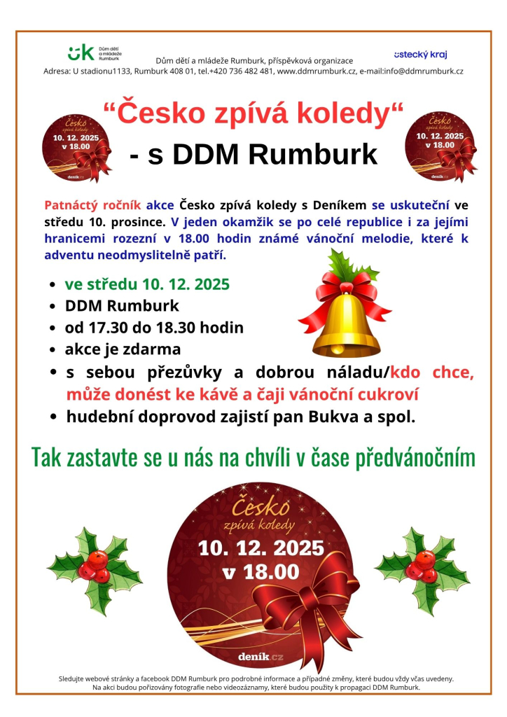 Sejdeme se 10. prosince 2025 v 17.30 hodin v DDM Rumburk, abychom si společně v jednu chvíli 18.00 hodin - opět zazpívali stejné koledy a prožili příjemný adventní čas. Ochutnávka cukroví/vaše vzorky k ochutnání-vítány/+ malá andělská dílnička pro děti.